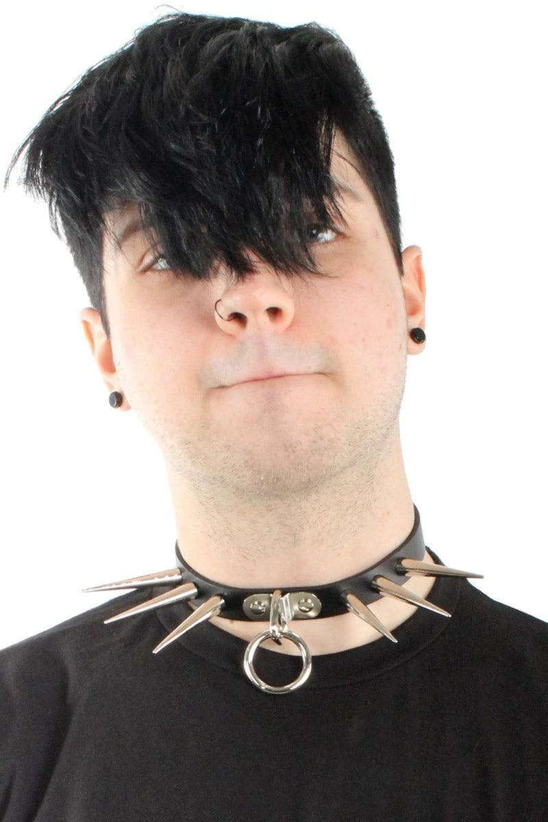Add some anarchy to your punk clothes with this hella hardcore collar, haunted with giant silver cone spikes! Made of genuine leather, this bondage choker is punk AF with its statement 2″ spikes, o-ring hardware, and back buckle close. No hugs allowed!