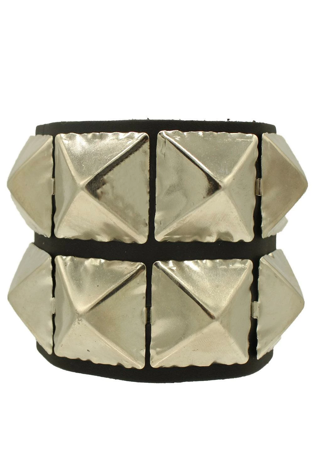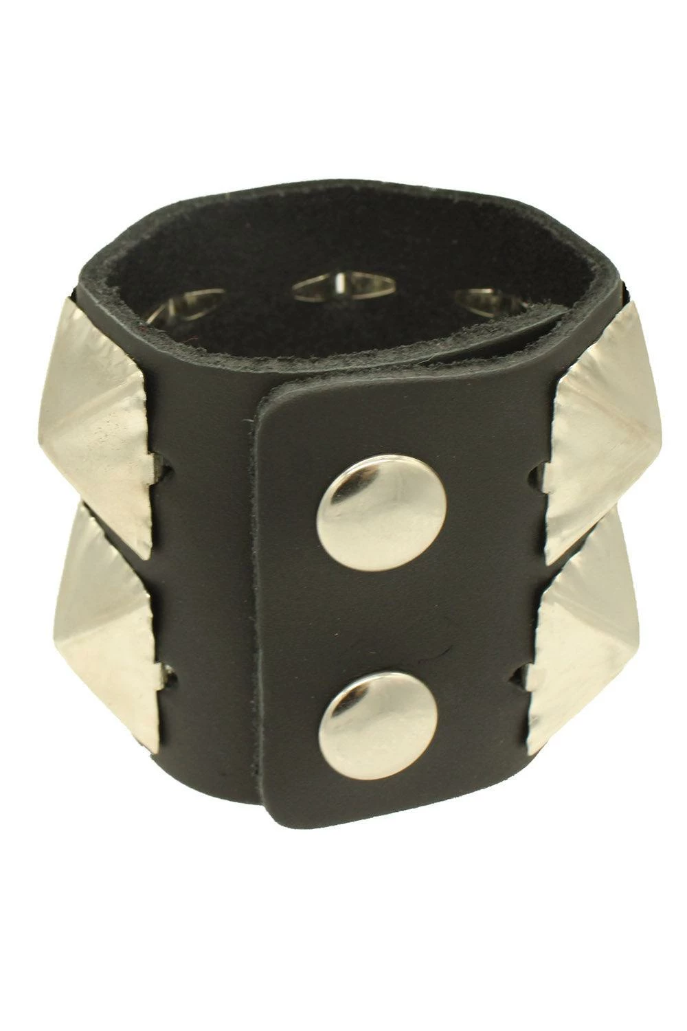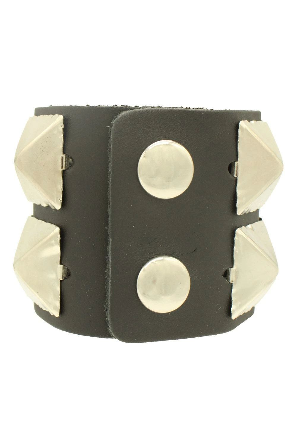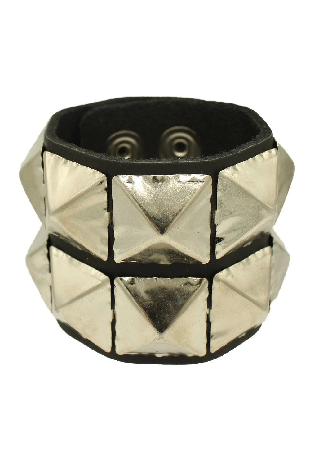 Emerge from darkness in this punk AF cuff bracelet. Constructed of genuine leather, this killer bracelet features 2 rows of large silver pyramid studs. Finished with a snap button closure for the sinfully perfect fit.