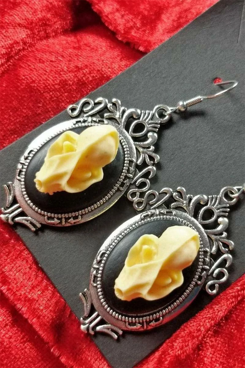 Take flight in these beautiful bat earrings, made in bat caves for taxidermy collectors and Victorian goths! Encased in floral cameo frames, these romantic goth earrings feature realistic bat skulls resting on black plaques. Designed to add instant spooks to any goth outfit.