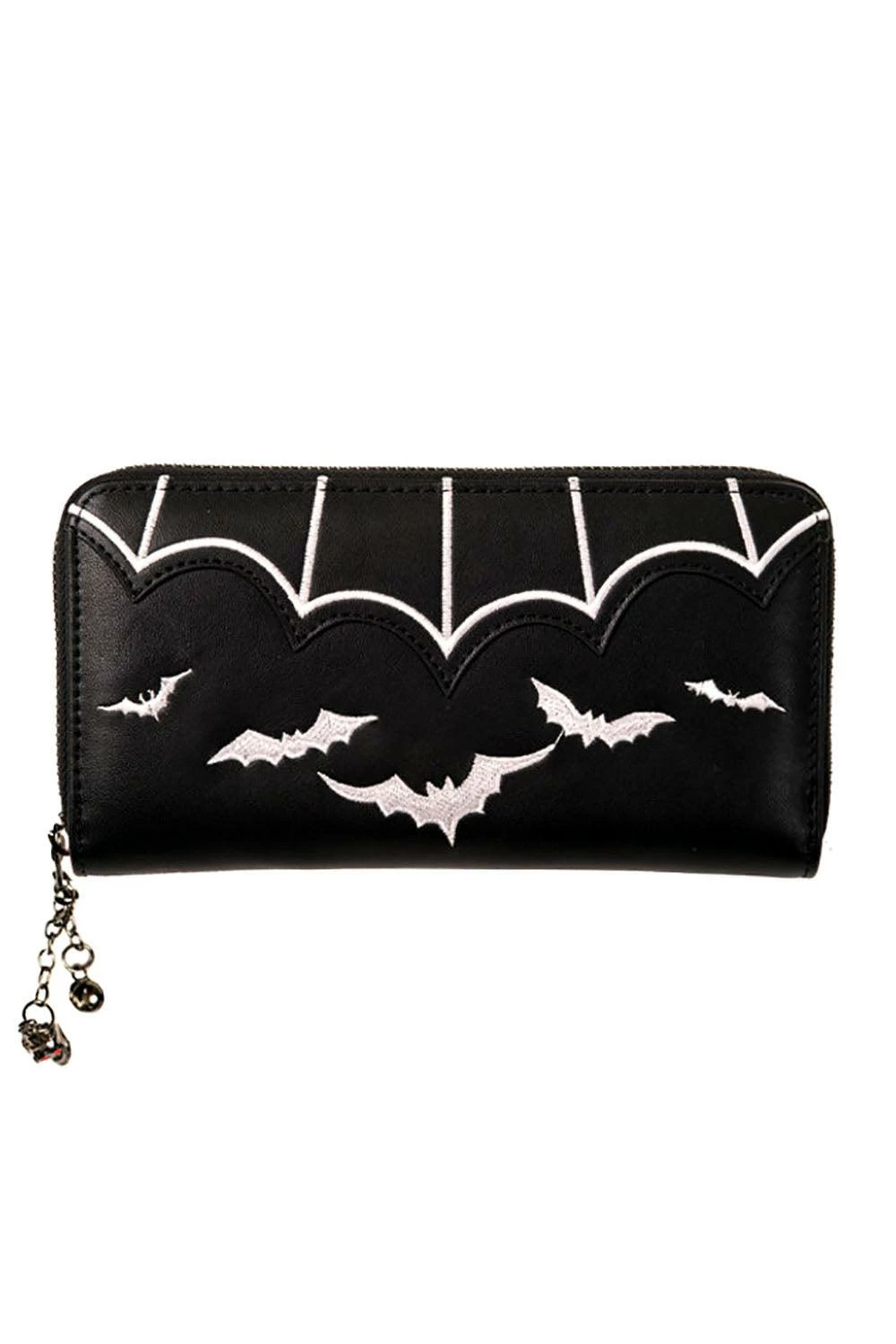 Take flight with this beautiful bat wallet! Constructed of premium vegan leather, this goth wallet features a cauldron of ghostly white bats and embroidered batwing detail. With 8 card compartments + change pocket, this gothic wallet is perfect for keeping your money safe and spooky!