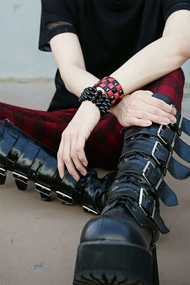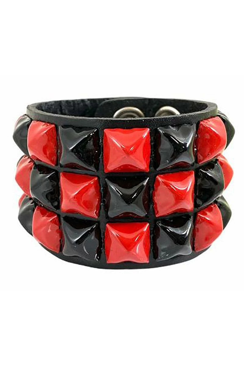 Bleed black and red in this statement punk cuff bracelet! Constructed of genuine leather, this checkered bracelet featured 3 rows of pyramid studs. Finished with an adjustable silver buckle closure for the perfect punk fit.