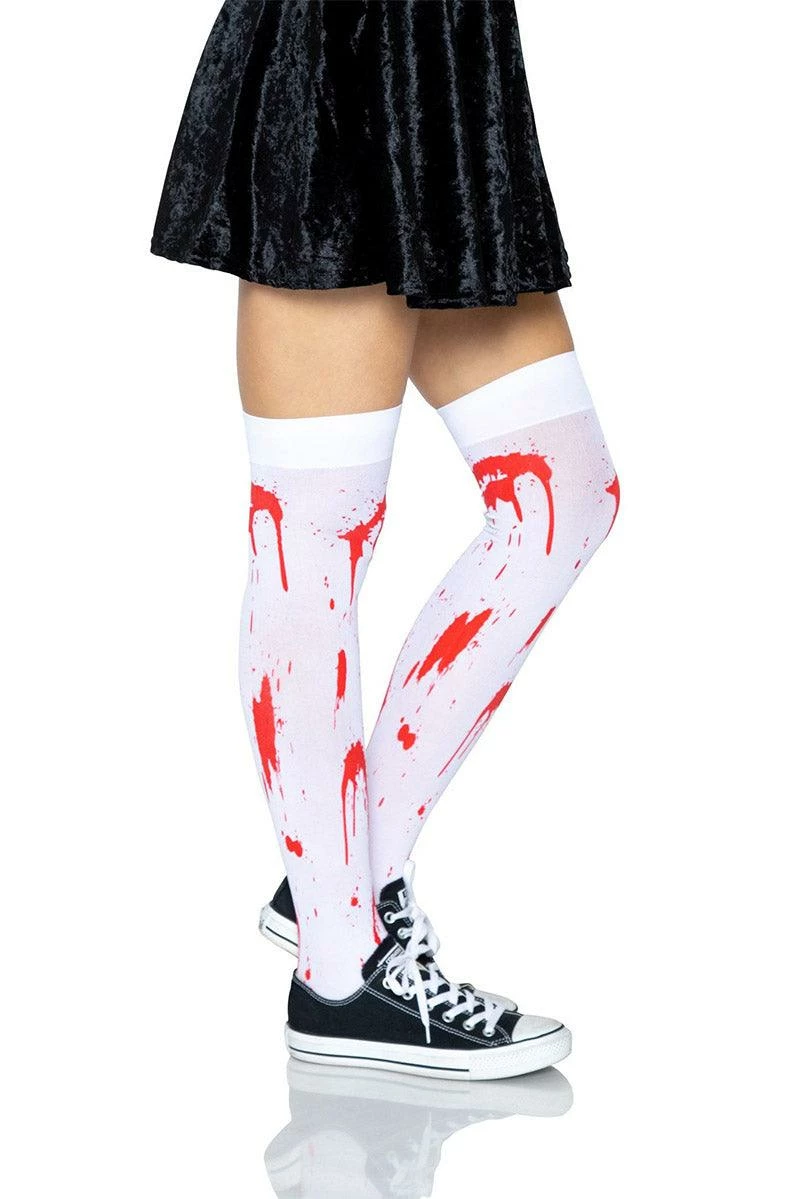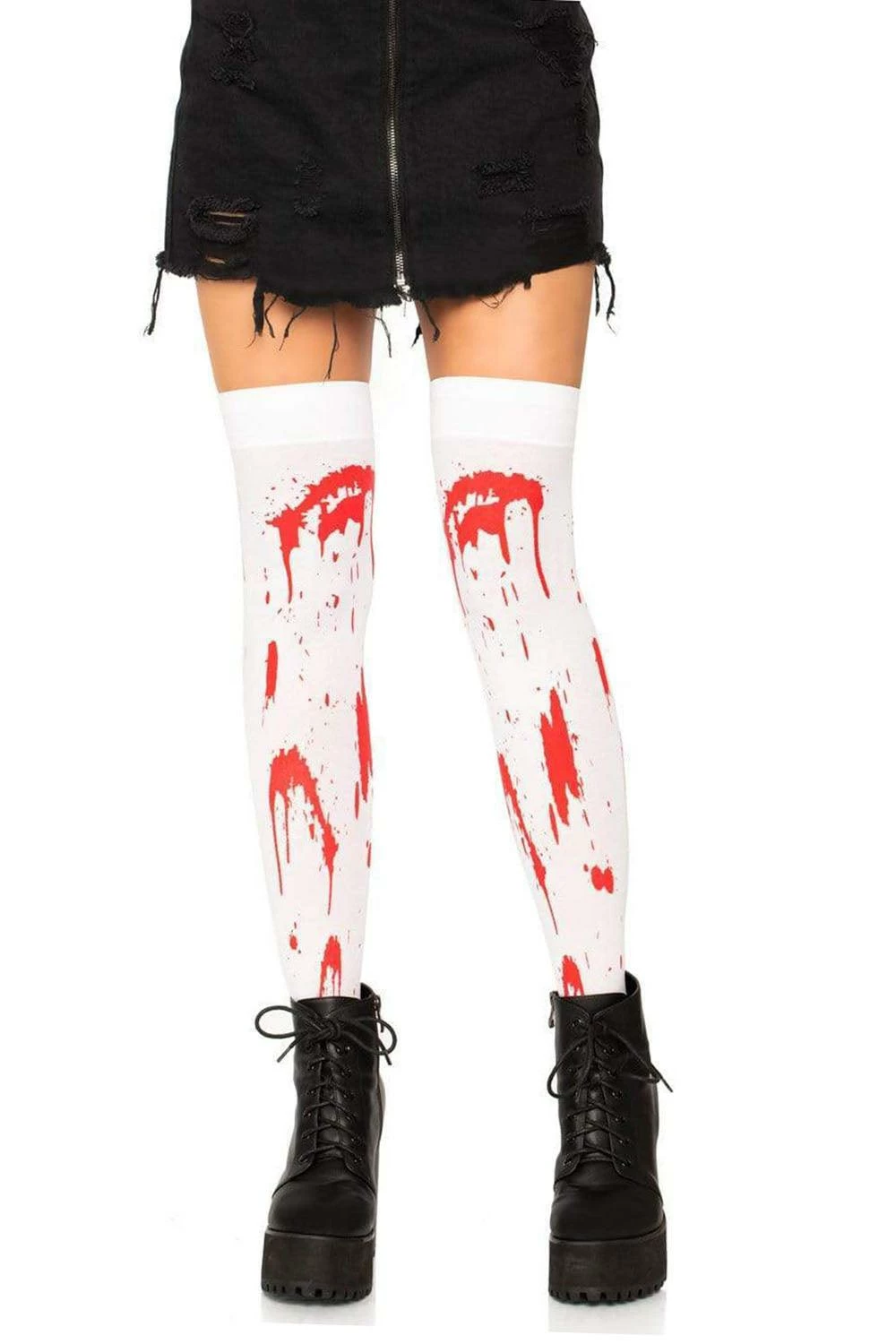 Be their bloody Valentine in these statement thigh highs, made in hell for scream queens and zombabes! Haunt their nightmares in the sinfully soft fabric, splattered with bright red blood. Perfect for summoning scares to your alt style!