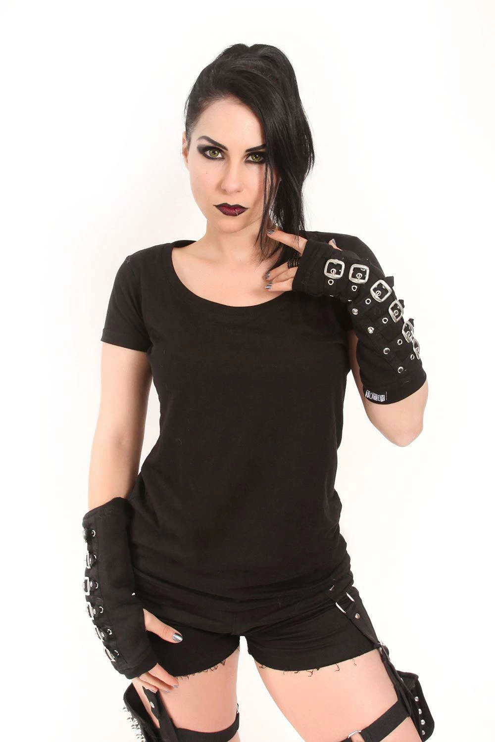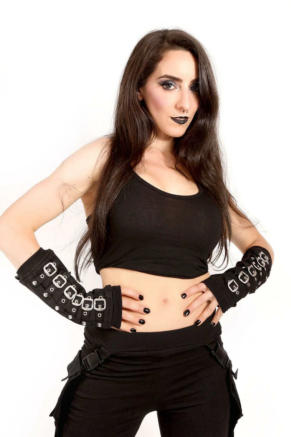 Haunt your arms in these killer goth gloves, loaded with an arsenal of buckle straps! Made of soft stretch cotton, these gothic arm warmers feature silver eyelets and adjustable accents straps all down the front for the perfect punk fit. Finished with thumbholes so you can freely text + hex.