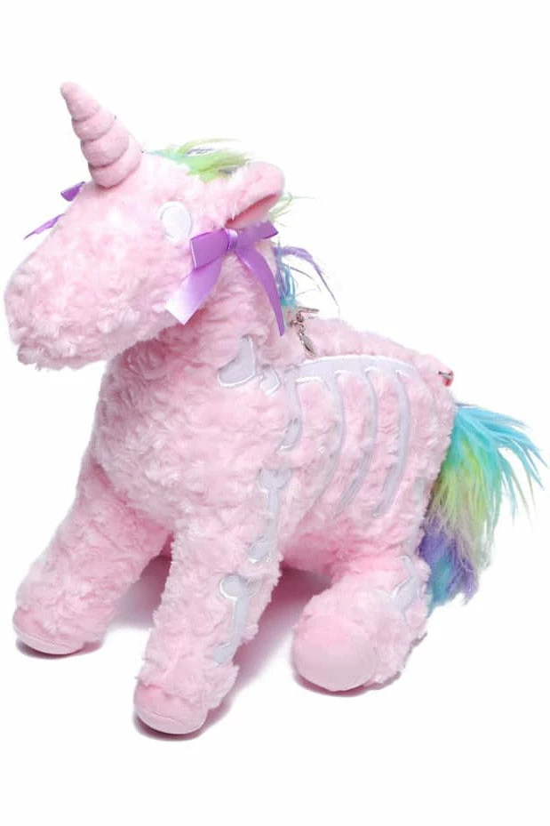 Tote your essentials in this cute n’ creepy kawaii purse, made for the wicked witch with a sweet side. This dead unicorn bag features soft baby pink body, white bone detailing, lilac bows, and fluffy rainbow pony hair. Next time you leave the crypt, store your smokes, phone, and emo tears in this plush animal purse! Â