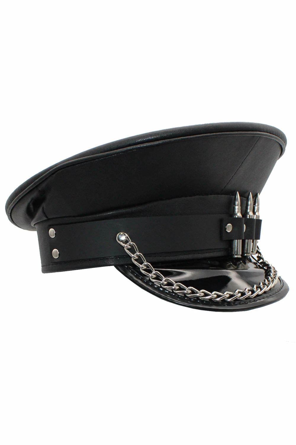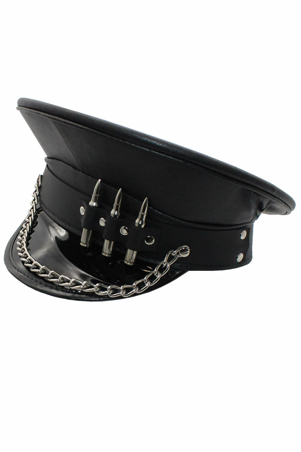 Command the army of darkness in this gothic militia hat, made in hell for bondage baddies! Summon military-grade scares with the shiny black vinyl brim, complete with silver circle studs, accent chain, and REAL bullet casings! An adjustable velcro strap inside for the sinfully perfect fit.