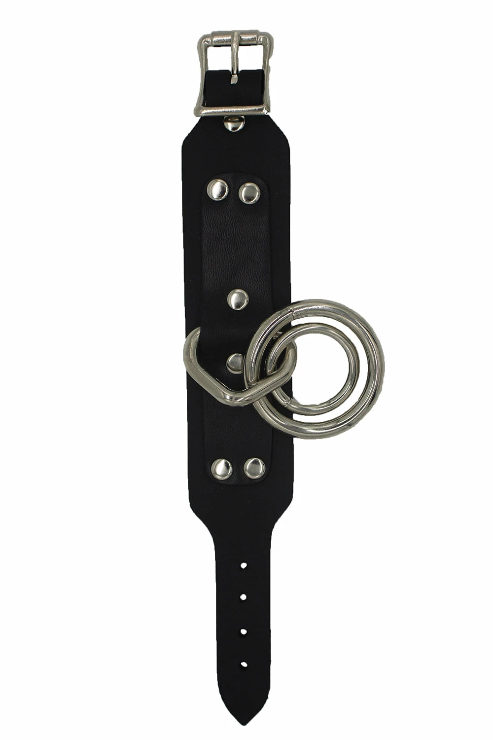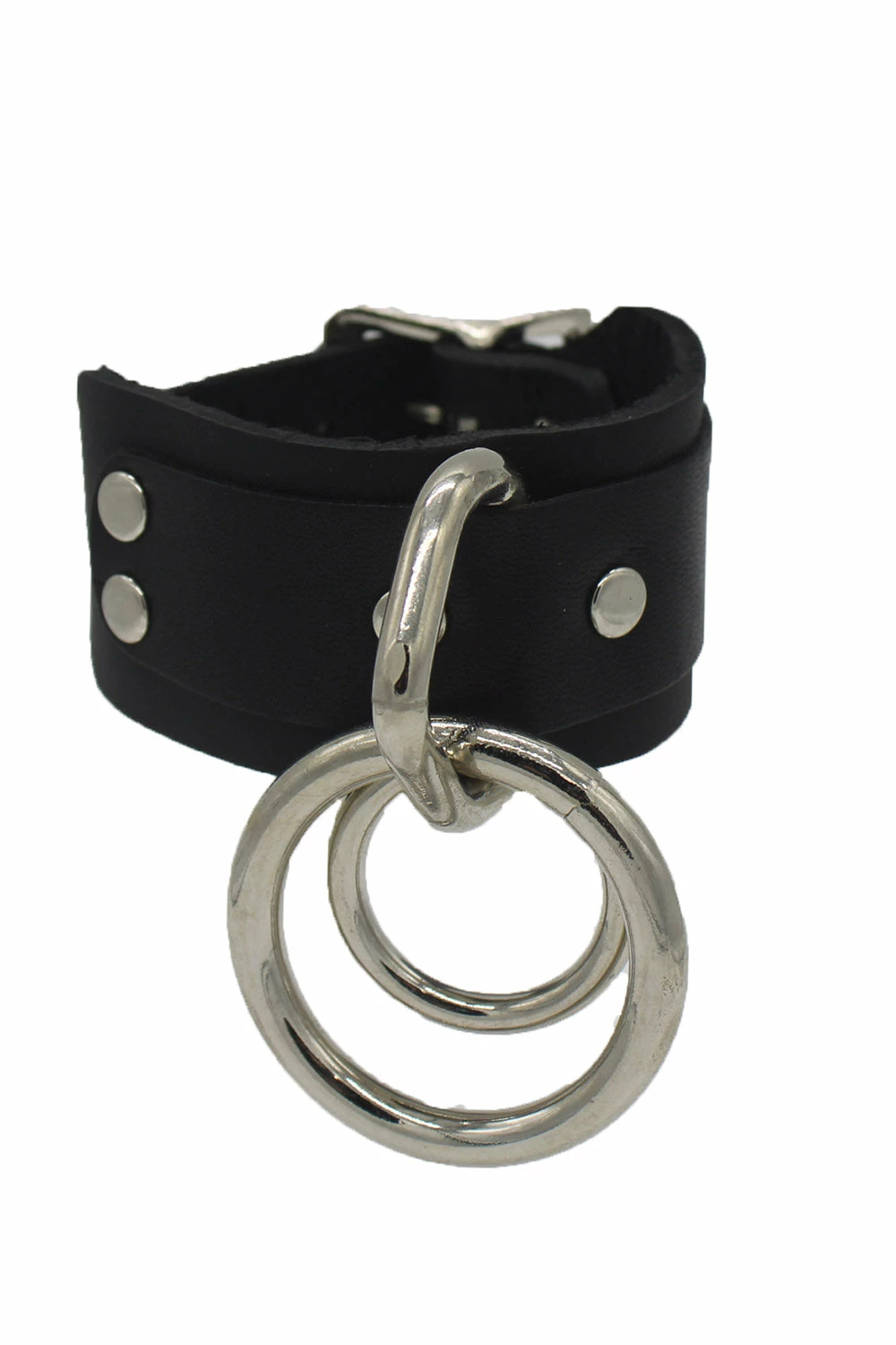 Leather bondage bracelet featuring 2 o-rings and adjustable metal buckle.