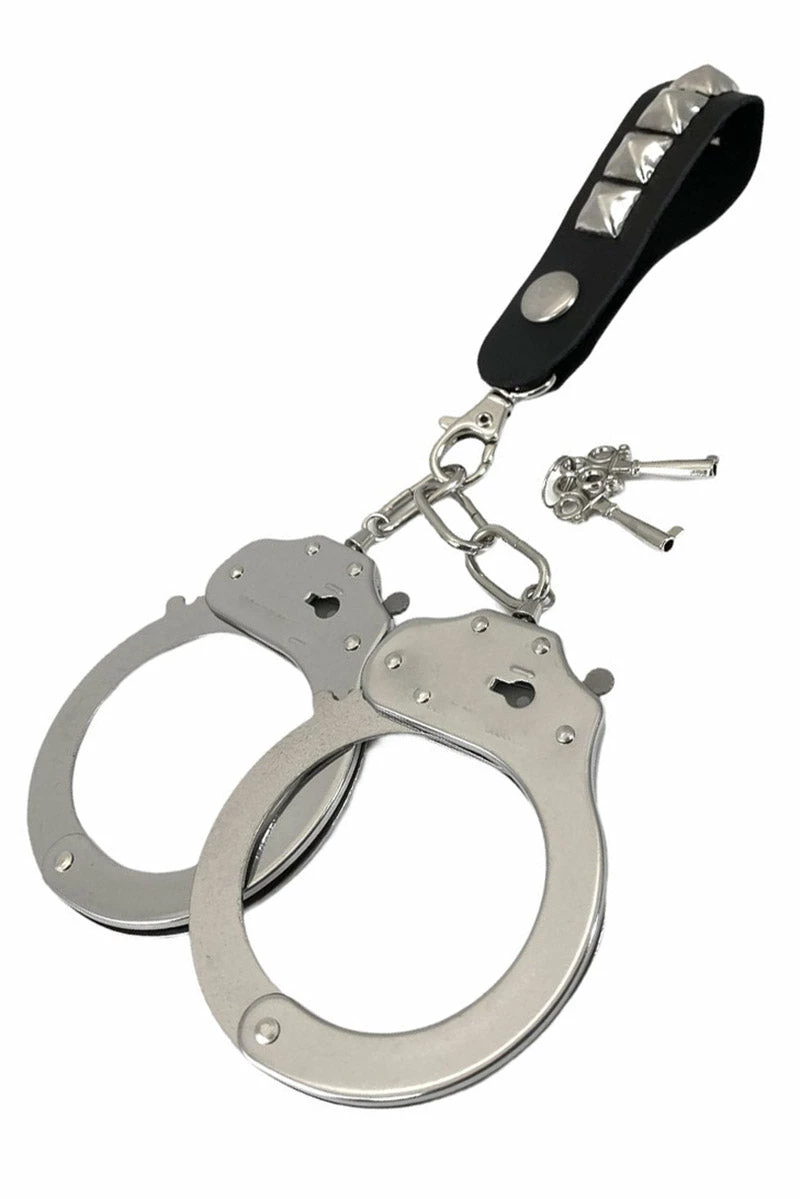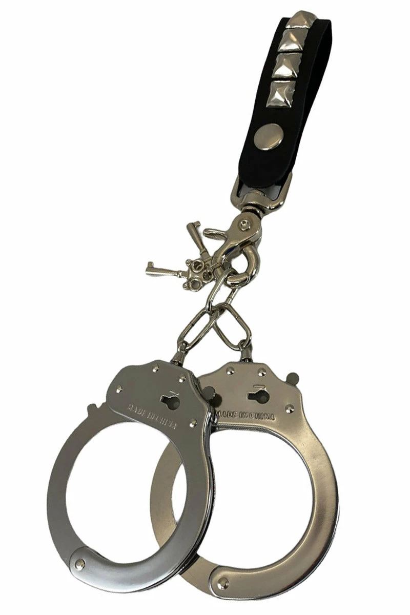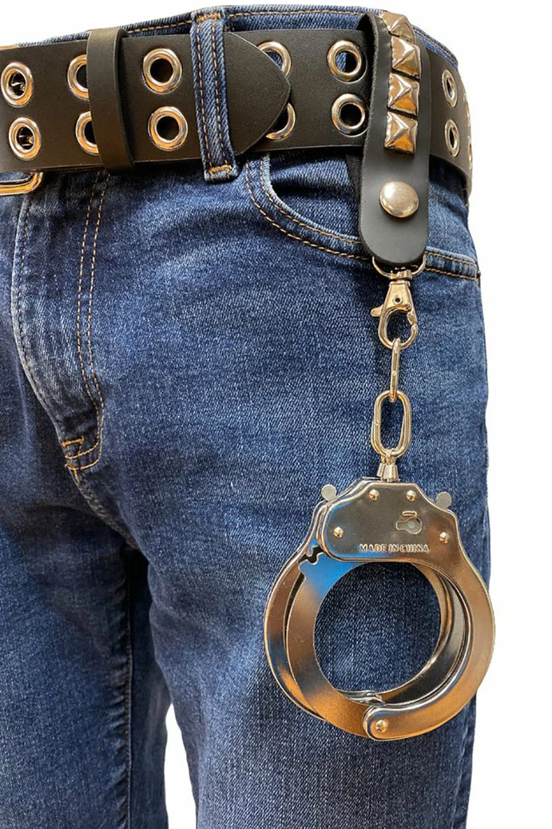 Keep your handcuffs on the ready with this hella hardcore pant accessory! Snap the strap around your belt loops to summon scares to your alt style. Made of 100% genuine leather, this statement strap is loaded with an arsenal of silver pyramid studs. Rock or remove the detachable handcuffs—functional AF. Keys included to please your dark desires.