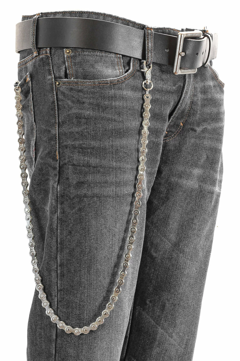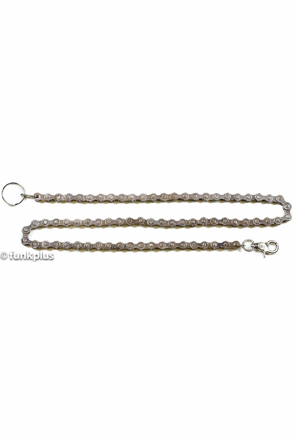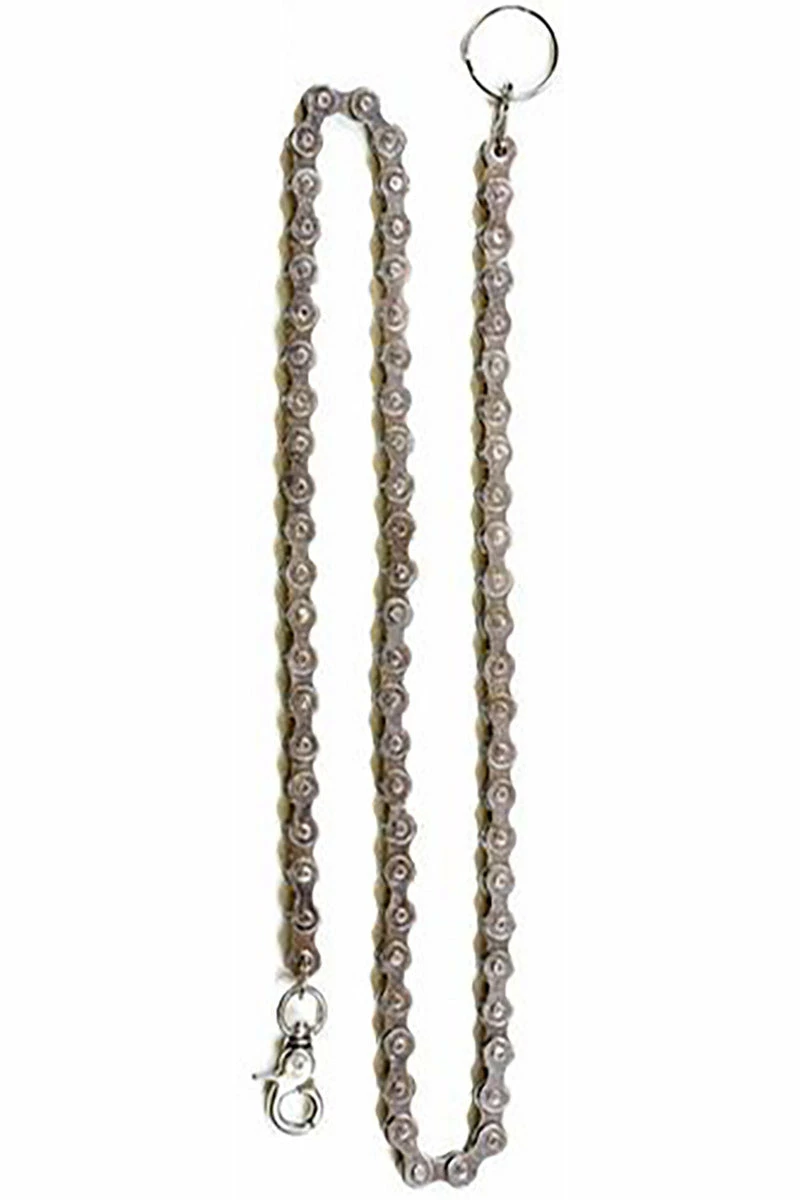 Raise hell with this hella hardcore pant accessory! Made of solid metal, this silver chain is constructed just like a real bike chain! Never lose your keys again with the split ring and clasp closure for attaching to your belt loops. Perfect for punks, metalheads, and badass bikers.