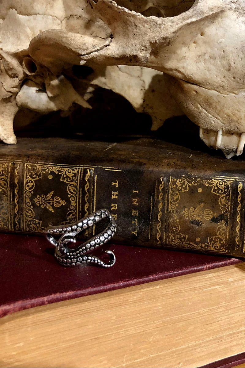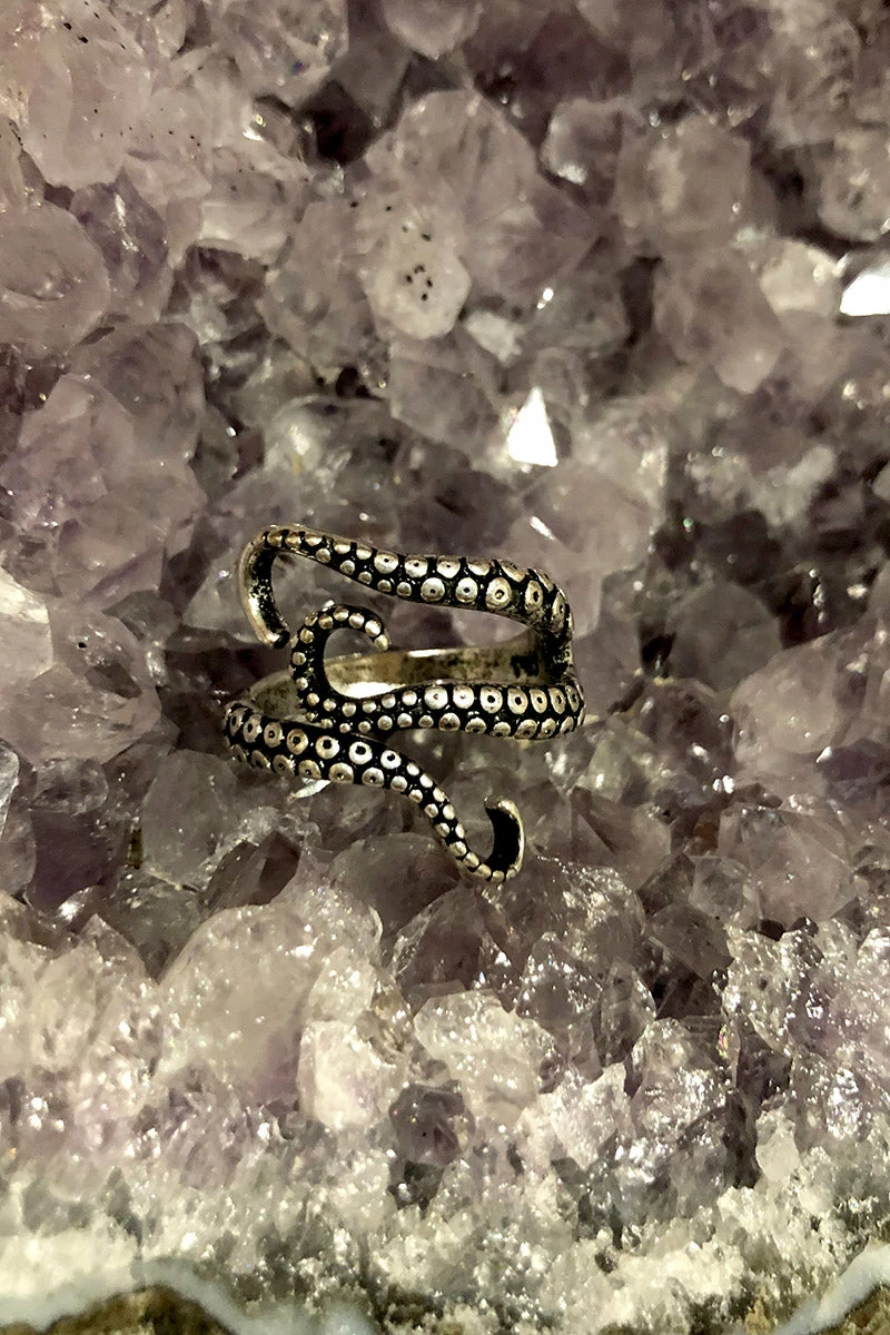 Invoke ancients of the deep with the Tentacle Ring! Made of high-quality metal, this statement steampunk ring conjures monsters of the deep with its swirled structure and textured tentacles. Simply pinch the tentacles together to fit any finger. Make dark waves in the aged finish.