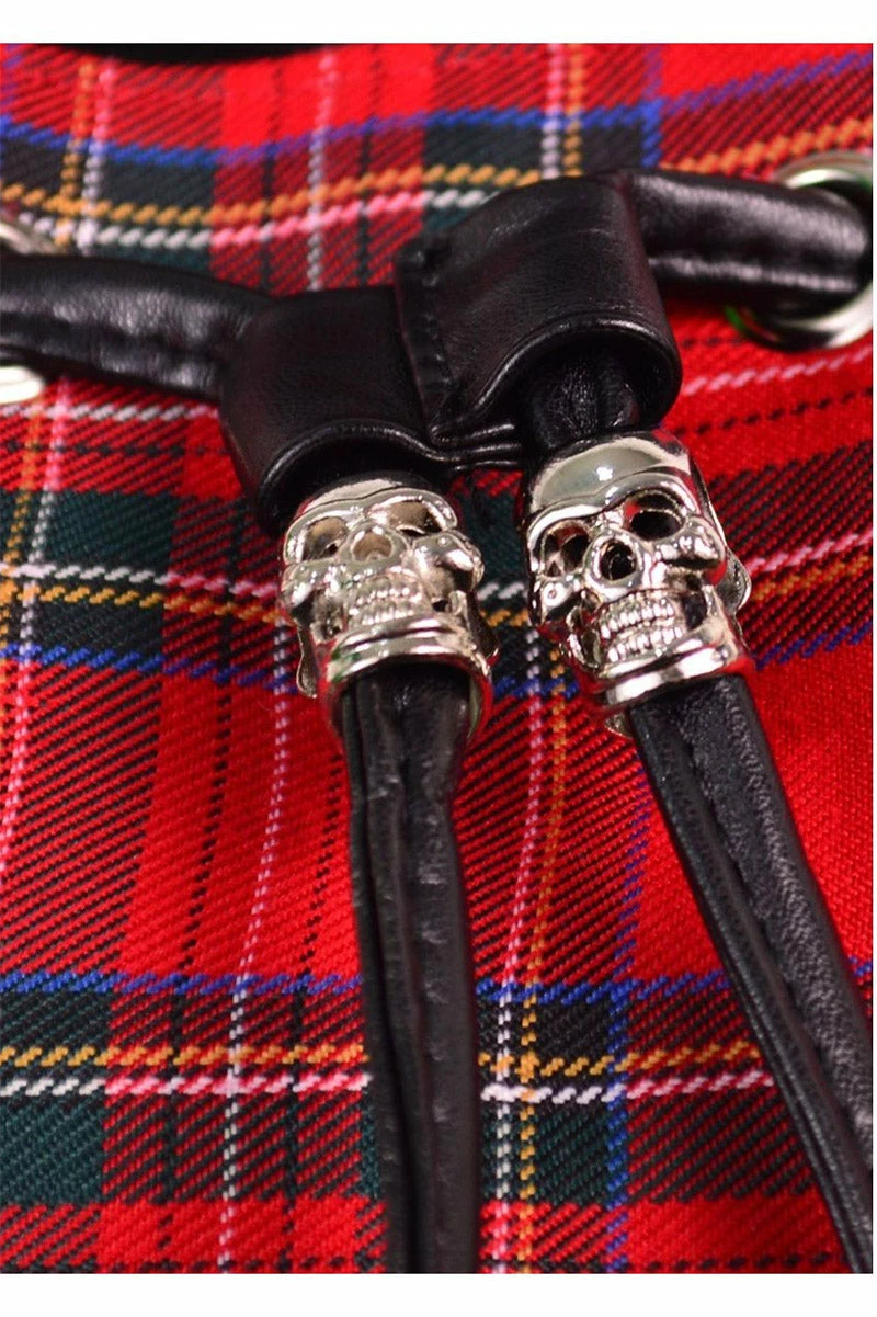 Keep punk alive with this red tartan backpack, perfect for carrying your smokes, wallet, phone, and spray paint! Keep your essentials safe in the sizable main compartment, secured with a drawstring and magnetic closure. Rock your rebel side in the silver circle studs, metal hardware, and vegan leather accents. Tote small goods like coins, makeup, pens, etc. in the detachable purse… plus two extra front pockets for extra space. Hell yea!
