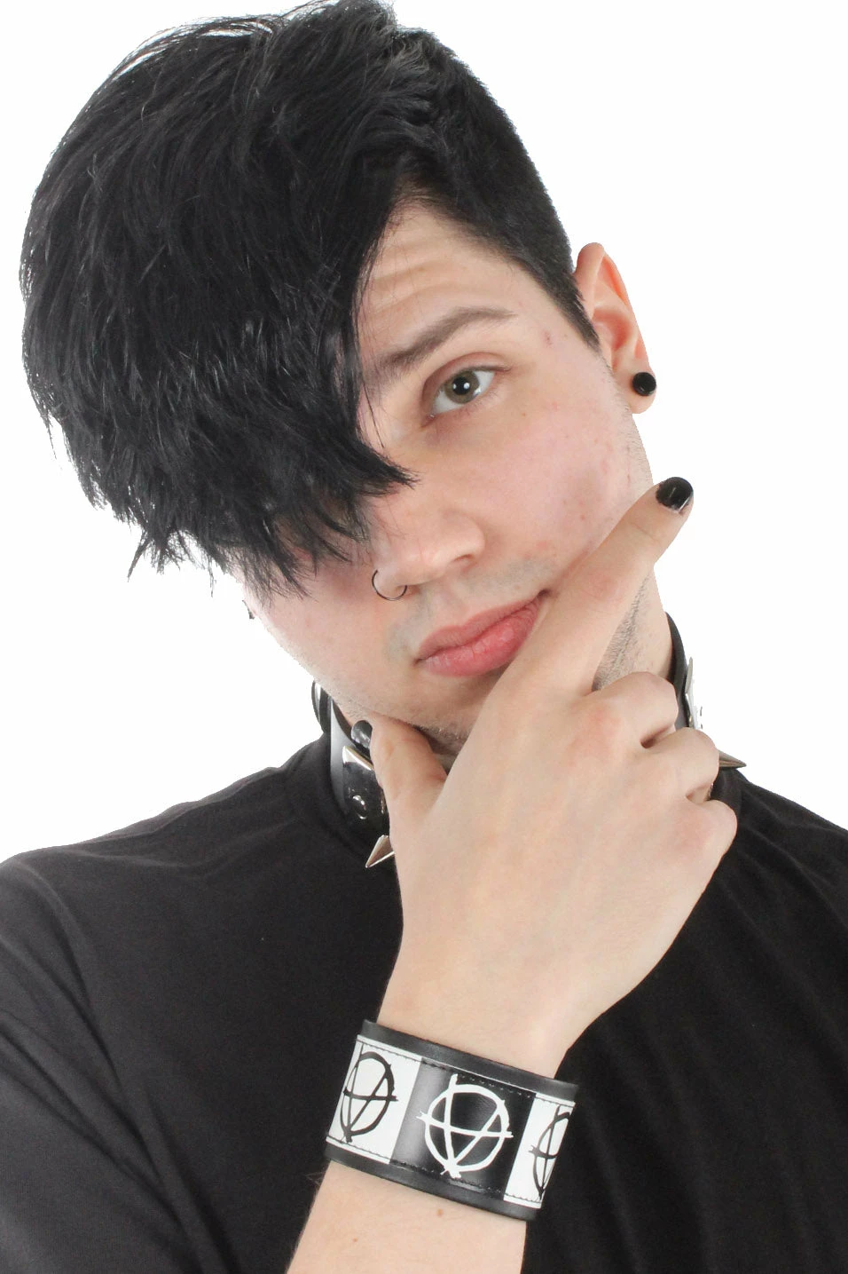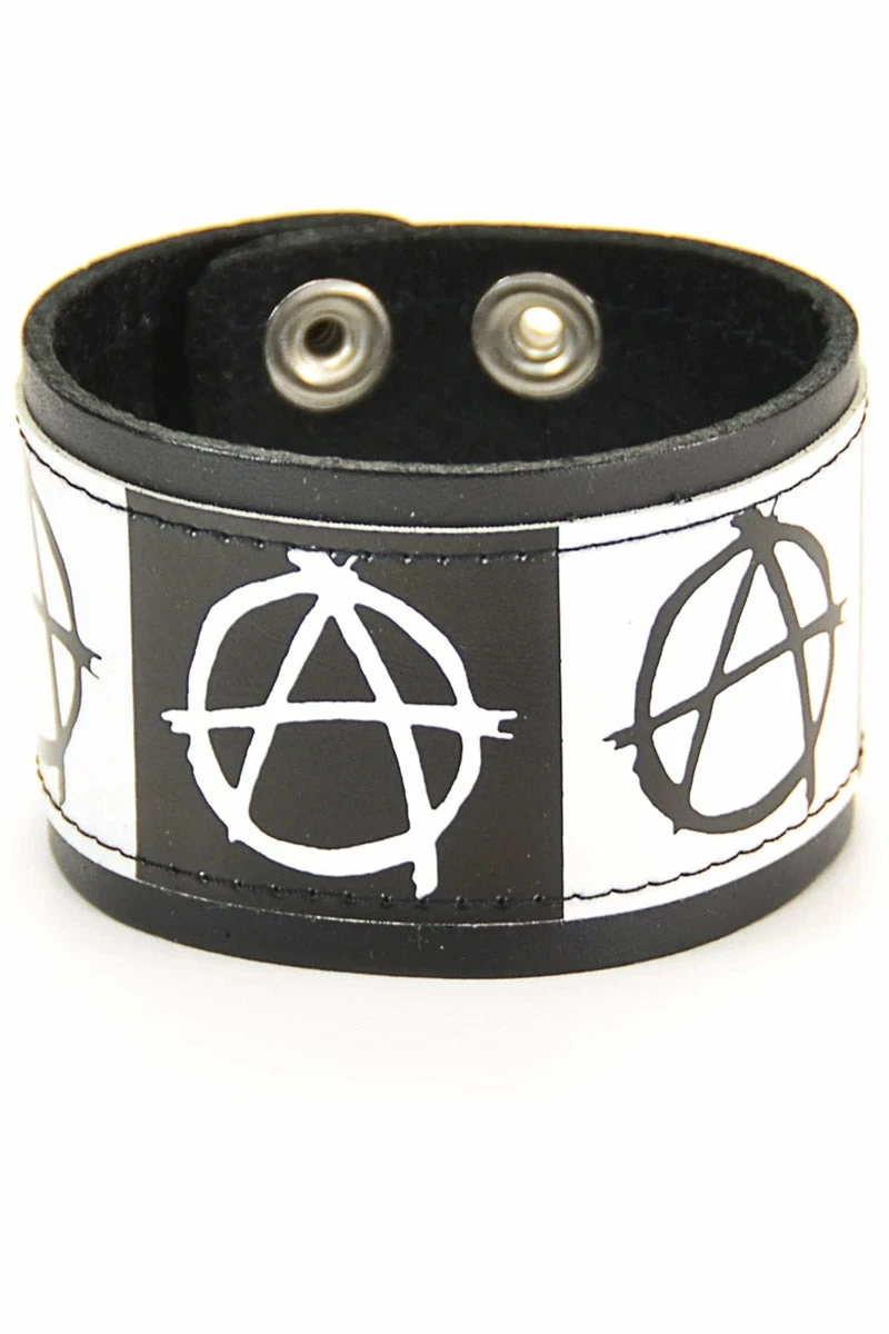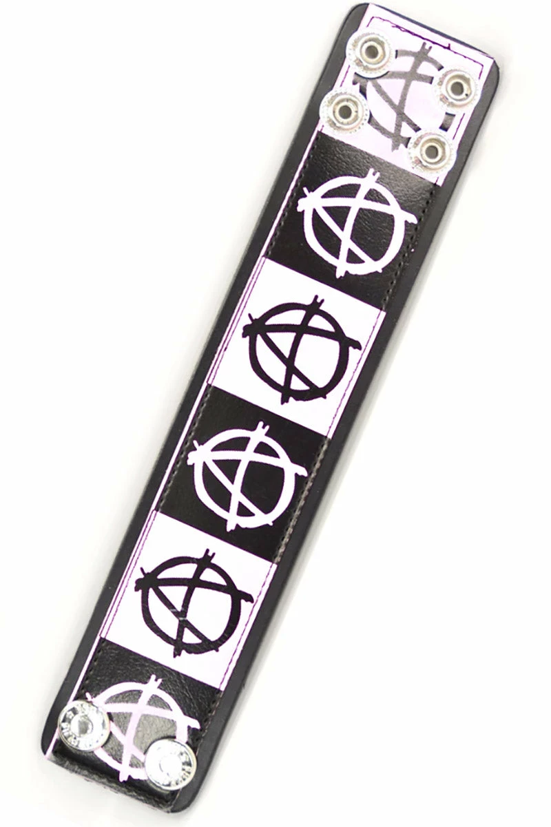 Raise hell with this hella punk cuff bracelet! Black and white, this statement bracelet features slashed anarchist symbols in contrasting squares. Made of genuine leather with an adjustable silver snap closure for the perfect fit