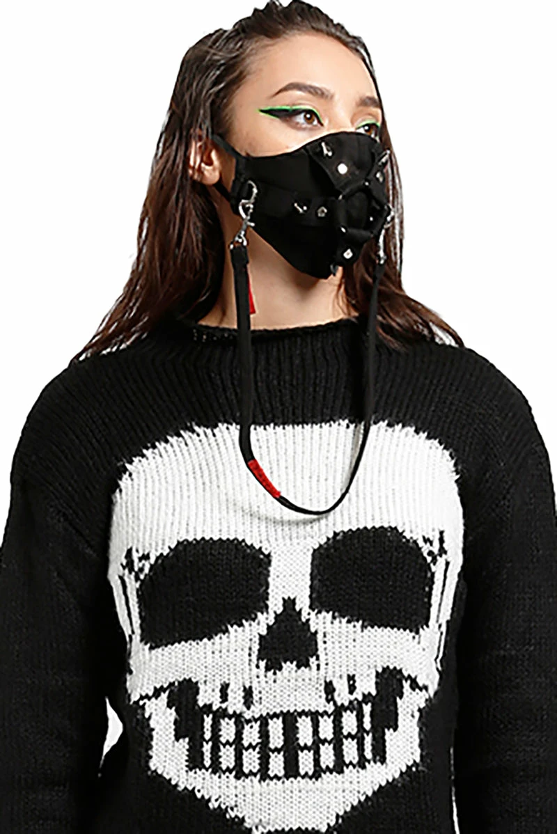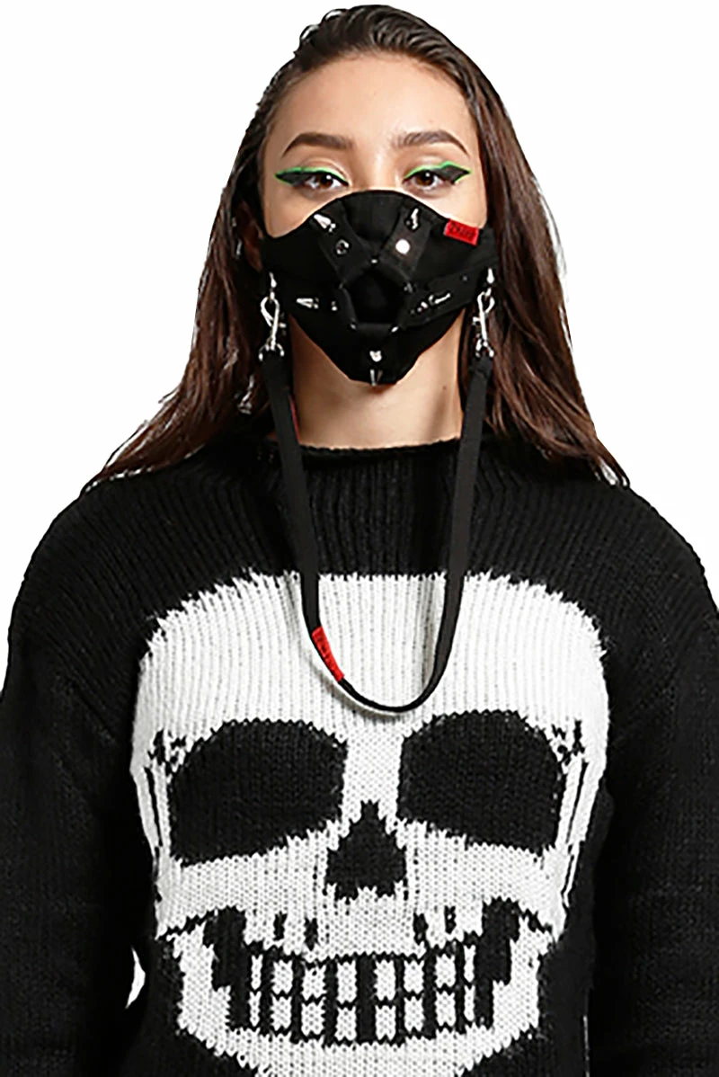 Harness the chaos of night in this epic face mask! Protect yourself in spooky style in the quality black cotton, made of the same material as Tripp pants! Features a center statement o-ring, metal eyelets, and silver spikes. Rock or detach the strap… perfect for resting around your neck when not in use.