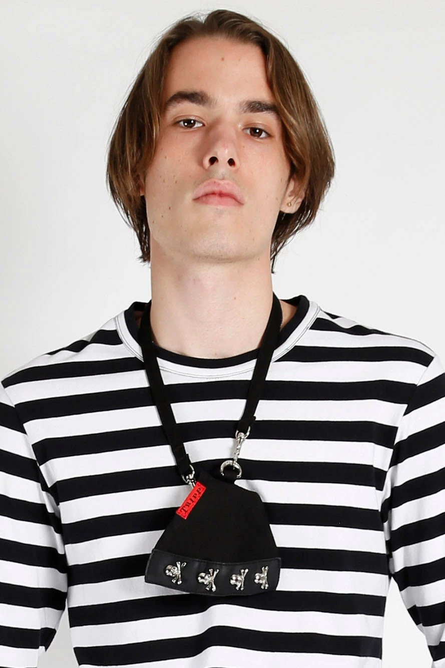 Haunt the streets in this bondage face mask, loaded with a statement strip down the front + metal accent skulls. This mask is made of the same dope material as Tripp pants. Hang the detachable strap around your neck for easy on-and-off removal, so you never lose your mask again! Take that, Covid.