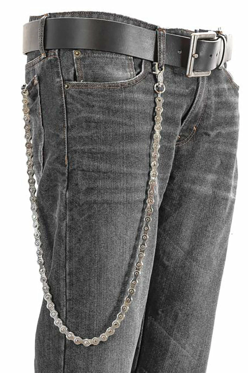 Raise hell with this hella hardcore pant accessory! Made of solid metal, this silver chain is constructed just like a real bike chain! Never lose your keys again with the split ring and clasp closure for attaching to your belt loops. Perfect for punks, metalheads, and badass bikers.